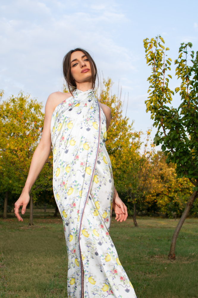 Njegova bela boja i prefinjeni Silki print dodaju sofisticiranost i luksuz svakom komadu odeće koji se od njega izrađuje.